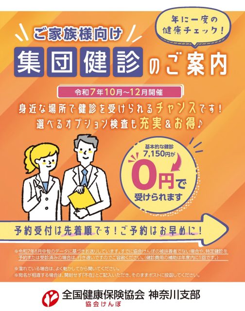 『ご家族様向け集団健診のご案内』が届いた方へ 2025年9月29日2025年9月29日 協会けんぽから以下のパンプレットが届いた方へ 上記、ご案内が届いた方は、P4「申込(予約)方法」から2次元コードを読取ください。 また、以下ホームページからも「ご予約リクエスト」が可能です。 予約はコチラ https://www.sempos.or.jp/kk/yokohama/news/tokutei_kanagawa2025/ 人気会場は、予約が取りにくくなっておりますので、お早めのご予約をお願いいたします。 特定健康診査受診券の申請については、コチラ [お申し込み・お問い合わせ] 📩 tokutei_yokohama@sempos.or.jp ☎ 045-651-1574(平日のみ 9:00~16:00)